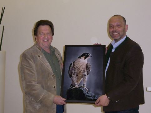 Nach den Berichten der Falknermeister Bayerns und dem Kassenbericht erfolgte die Verabschiedung des langjährigen Vorsitzenden Wolfgang Schreyer, der im letzten Jahr aus gesundheitlichen Gründen nach einer fast 15-jährigen Amtszeit zurückgetreten war. Seine herausragenden Leistungen für den Verband und die Falknerei konnten mit Worten gar nicht ausreichend gewürdigt werden. Als Erinnerung an seine Tätigkeit als „Oberfalkner“ bekam er ein Fotokunstwerk eines japanischen Fotografen in limitierter Auflage überreicht, das ein „Objekt“ seiner Berufung zeigt, das Portrait eines Wanderfalken.