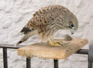 Rechts: Junge Turmfalken aus Gebäudebruten, die häufig auf der Straße landen, sind nicht immer wieder in die Nachbarschaft ihren Nistplatzes zu bringen und werden daher in der Station aufgezogen und fachgerecht ausgewildert. |