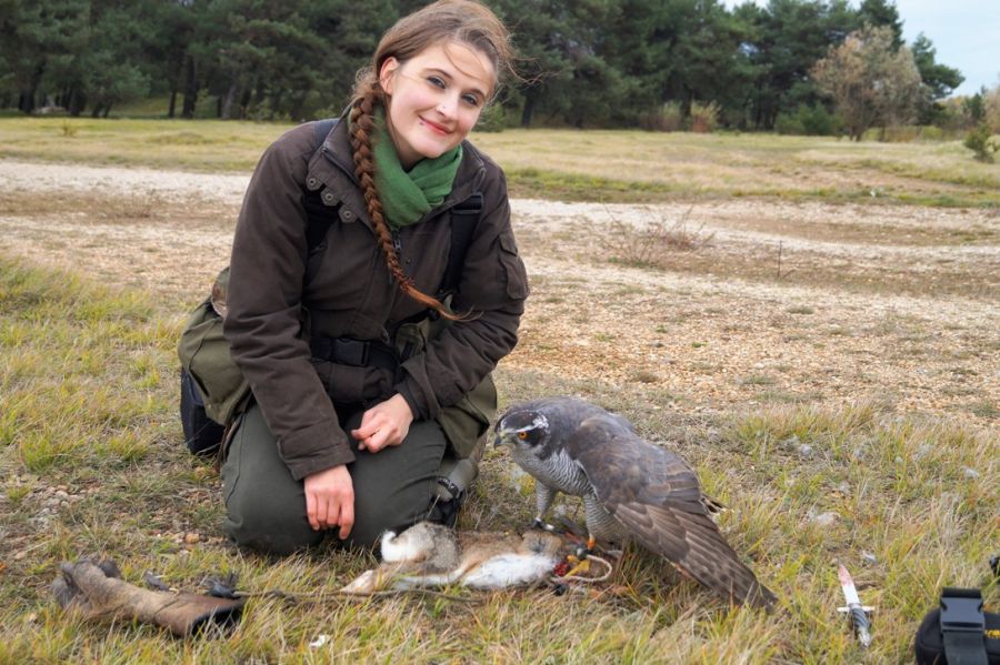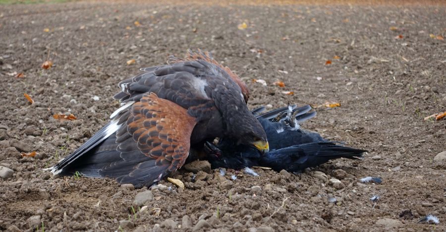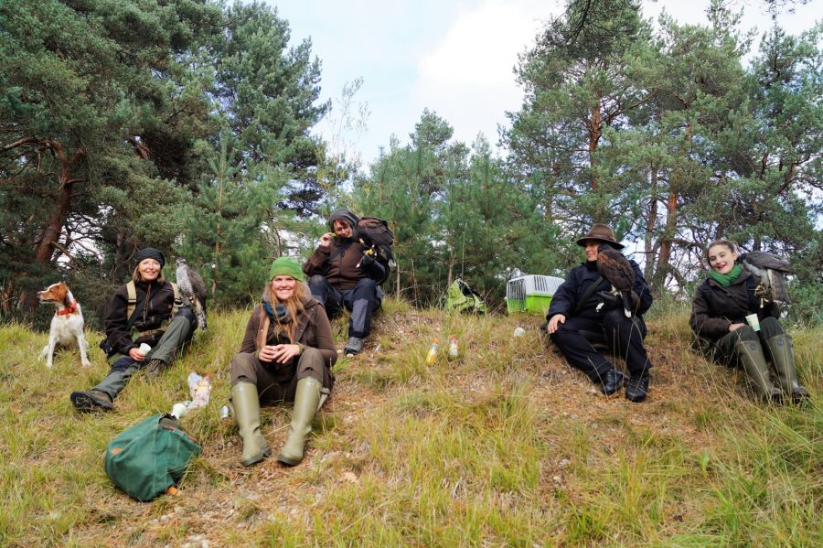 Zu allem Überfluss war uns Petrus an diesem Tage nicht wohlgesonnen. Es war stürmisch und kalt. Schlecht für Harris Hawk und Co. die erwartungsgemäß mit dem Wind am meisten zu kämpfen hatten. Die paar verbliebenen Kaninchen nutzten die Gunst der Stunde und machten sich gegen den Wind vom Acker. Nach ein paar hart erarbeiteten Fehlflügen zog der Weibercorps rund um Katharina für eine kleine Siesta in den Wald. Frettchen und Hund brauchten dringend eine Verschnaufpause und bei den einzigen Sonnenstrahlen des Tages holte man sich Kraft bei einer kleinen Brotzeit. Frisch gestärkt rettete das Nesthäkchen der Gruppe Rebekka, mit ihrem Habichtsterzel die Ehre der Truppe und beizte ein strammes Kaninchen.