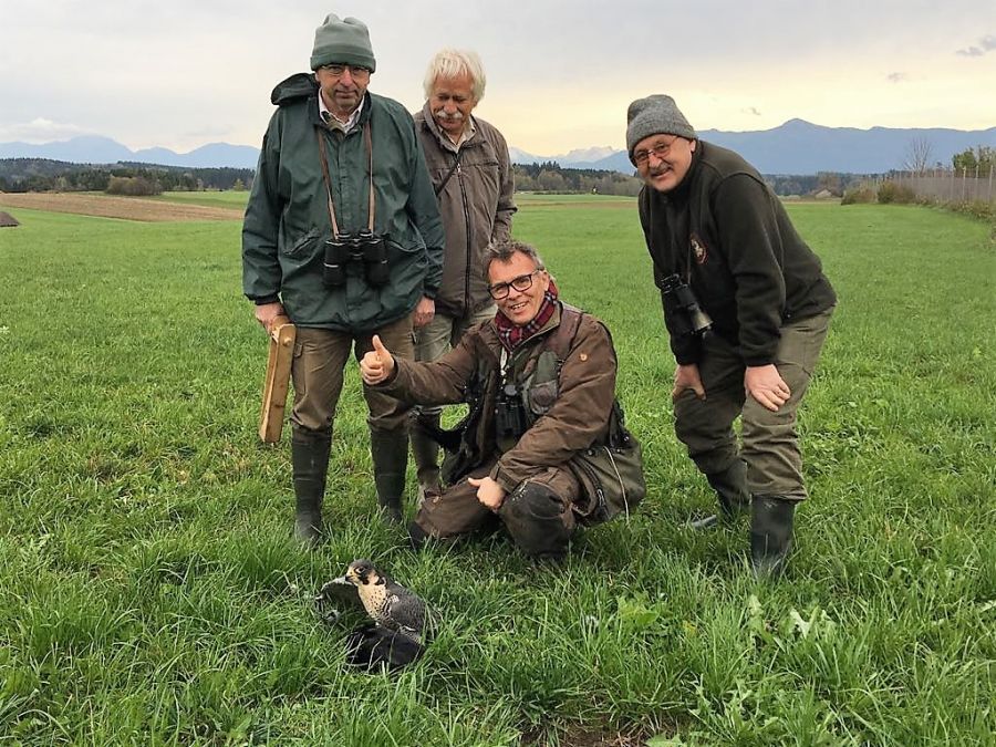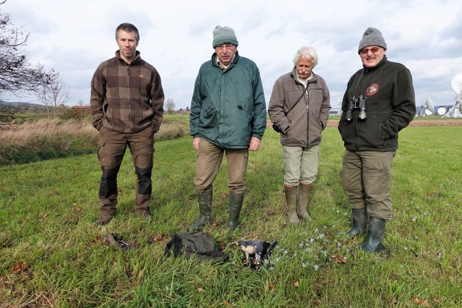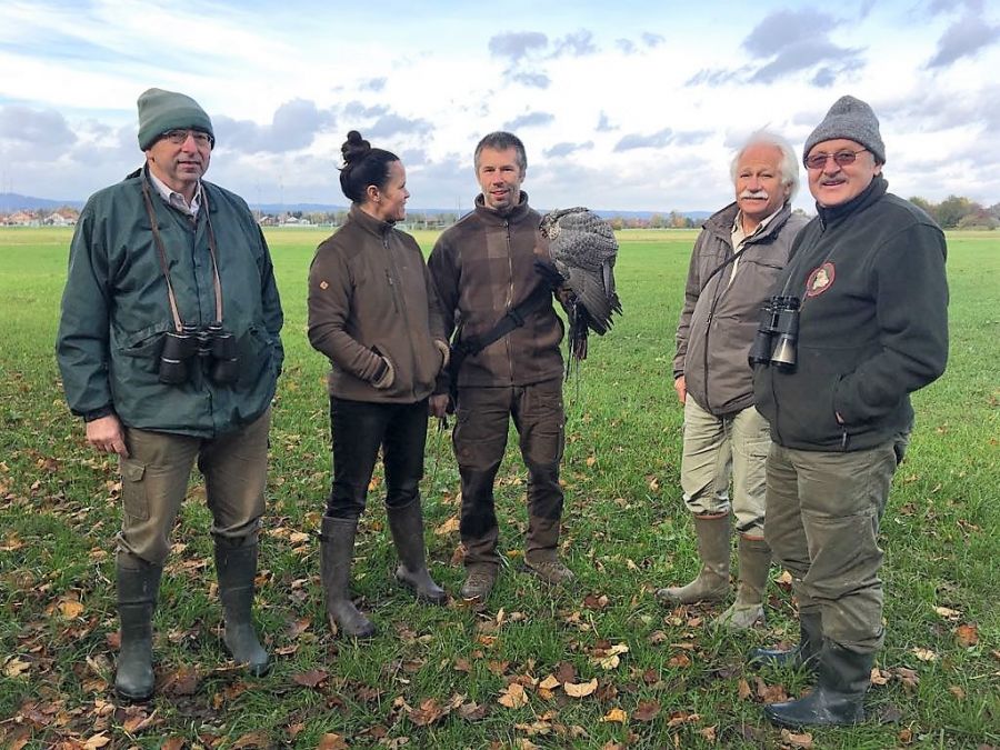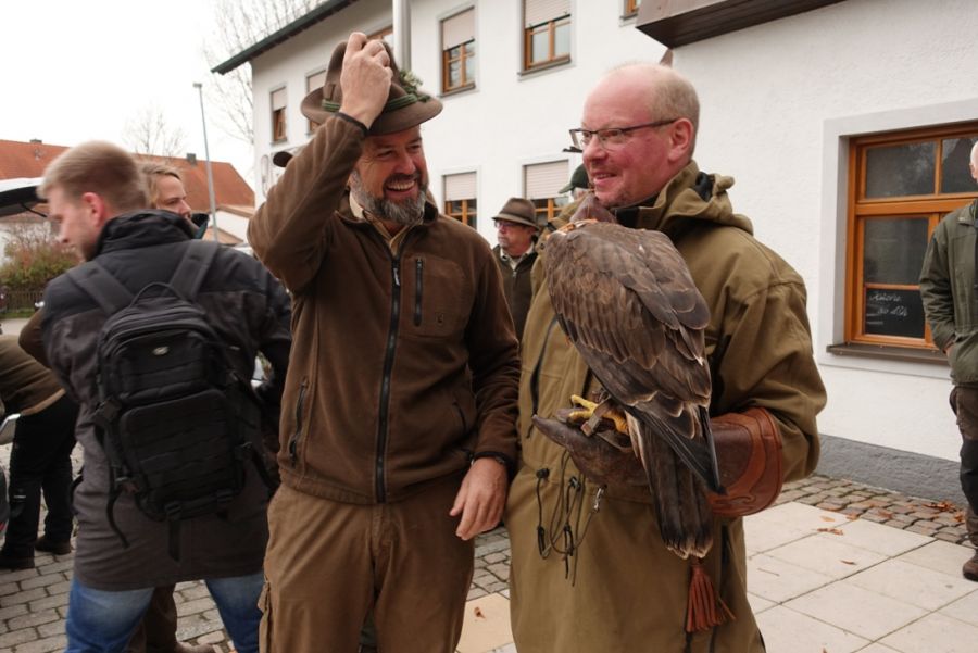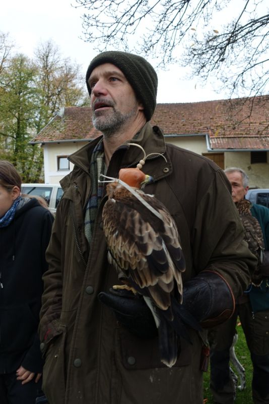 Zeitgleich ließ es sich Revierführer Robert Höfling nicht nehmen seiner Truppe gute Chancen zu bieten. Hier ließen Theo und Helmut mit ihren Vögeln die Chancen nicht ungenutzt und beizten die anderen beiden Kaninchen des Tages. Glück war ein seltenes Gut an diesem Tag und Wild sehen bedeutete nicht gleich es auch zu erbeuten. Albert Hartels Gruppe kämpfte mit den Unwegbarkeiten des Windes und gelegentlich auch mit den Brombeeren. Die Krähenfalkner Meik Kraus mit Wanderfalkenterzel, Uli Kreutz mit Gerterzel und zwei Wanderfalkenterzel, Werner Harantmit Harrisweib und Klaus Leix mit seinem Wanderfalkenweib waren trotz der schwierigen Wetterverhältnisse mit allen eingesetzten Vögeln erfolgreich. Martin und Daniel Lodermeier erbeuteten mit ihren Habichten ebenso wie die Adlermänner Hannes Lenhart, Uli Jaser und Volker Roth jeweils einen Hasen, Hannes schaffte sogar zwei. Nach dem abendlichen Streckelegen trafen sich die Falkner zu einem„gemütlichen“ Abend im Gasthof zur Post in Eitting im windstillen Gastraum und fachsimpelten wie immer bis tief in die Nacht. Vielen Dank an dieser Stelle unserer geduldigen Gastgeberin Conny, die dafür sorgte das Wein und Bier nicht ausgingen.
