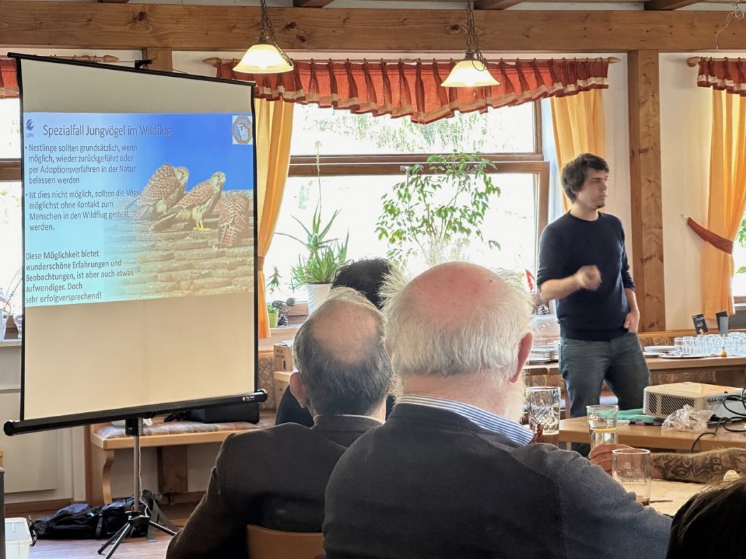 Anschließend folgte der Vortrag von Ferdinand Baer zum Thema „Allgemeines über die Rehabilitation von Greifvögeln“. Hier gab Ferdinand Einblicke in die LBV Auffangstation Regenstauf und seine langjährige Erfahrung in der Rehabilitation von Greifvögeln. Am Schluss ermunterte er die Mitglieder sich bei dem Besuch des kommenden DFO Sommerfestes in Regenstauf am 20. Juli 2024 selber ein Bild zu machen.