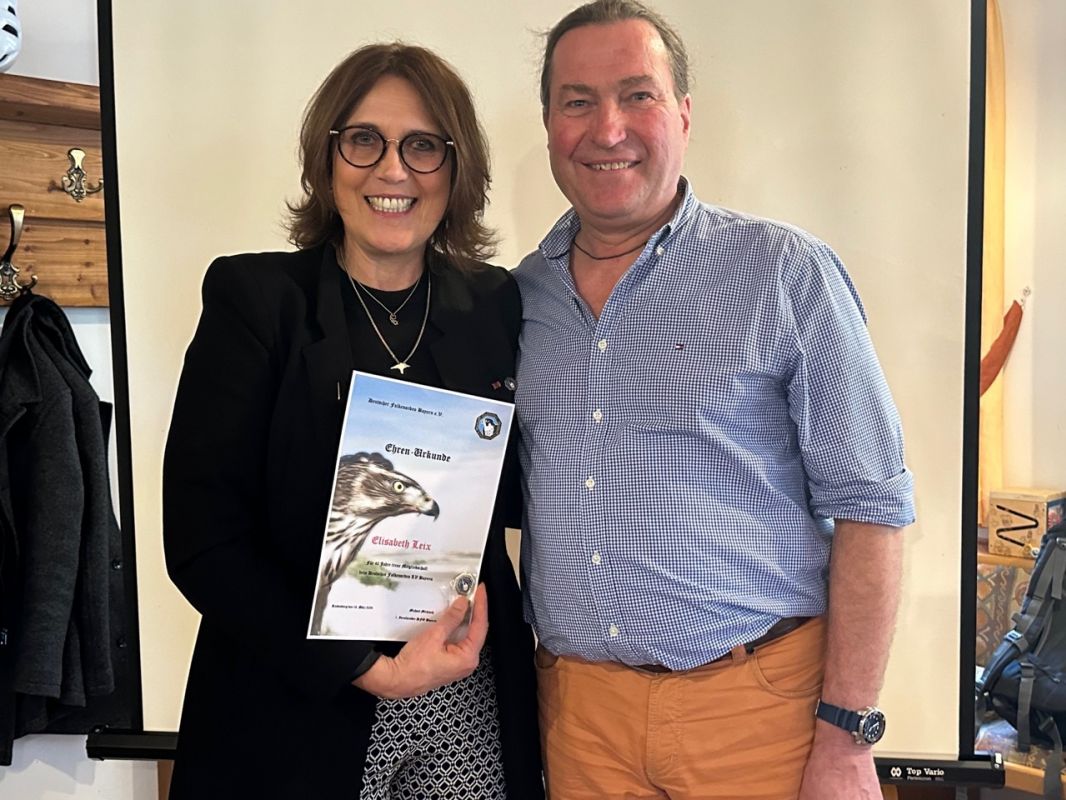 Elisabeth und Klaus Leix waren dabei, als unser Mitglied Kurt Hussong von der Stadt Fürth mit dem Ehrenzeichen des Bayerischen Ministerpräsidenten, Dr. Markus Söder, ausgezeichnet wurde. Diese Auszeichnung wird für Personen mit besonderem Engagement im Ehrenamt verliehen. Maßgeblich dazu beigetragen haben sein Engagement zum Schutz und Auswilderung von Wanderfalken sowie die Auffangstation, die er mit seinem Sohn Dr. Rainer Hussong betreut.